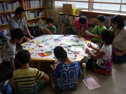 はじめは,大型絵本の読み聞かせがありました。その後,本の表紙を使ったしおりつくりをしました。世界で一つだけのしおりができました。
