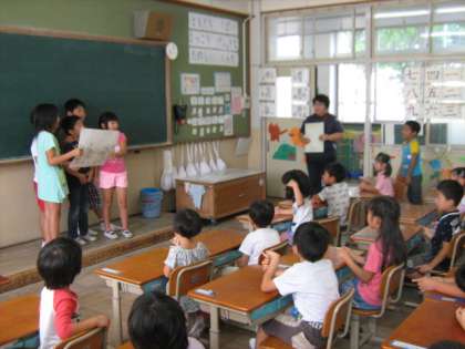 例えば、たてわり給食では担当の先生の教室で給食をとります。と説明があり、1年生が質問をしたり、感想を発表したりしていました。