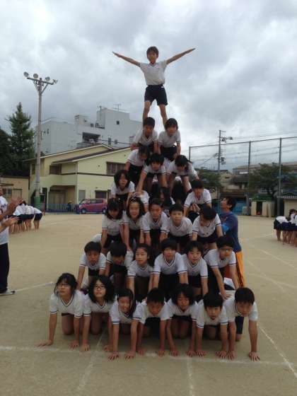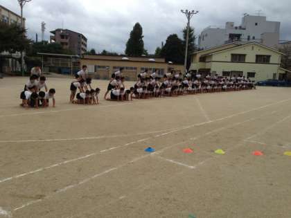 運動会まであと少しになり,団体演技の総仕上げをどの学年もしています。5・6年生で行う組体操も,最後の総仕上げに力を入れていました。「絶対成功させるぞ!」という強い気持ちが表れ,運動場は緊張した雰囲気に包まれていました。