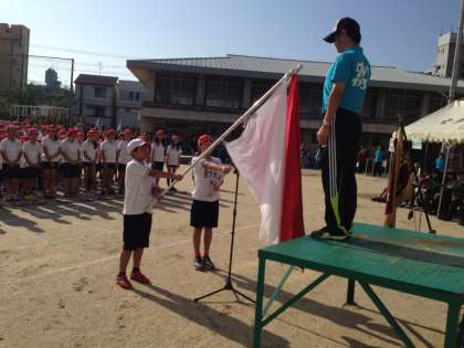 まずは,入場行進です。堂々と行進する子どもたち。格好良かったです。そして,開会式。応援団長による選手宣誓はとても立派でした。