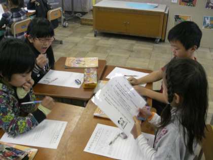 写真は2年生で意見の言いたい子どもが立って順番を待っている様子や班での交流の様子。