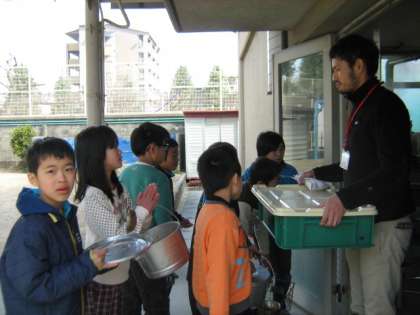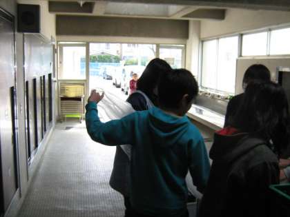 写真は上から、給食室に食管を返しに来ている様子、給食室での様子、運動場の様子です。