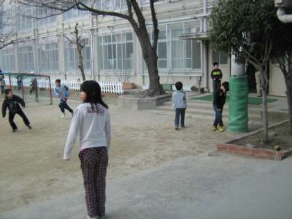 給食の後、昼休みで雪が振る中子どもたちはそれぞれ遊んでいました。