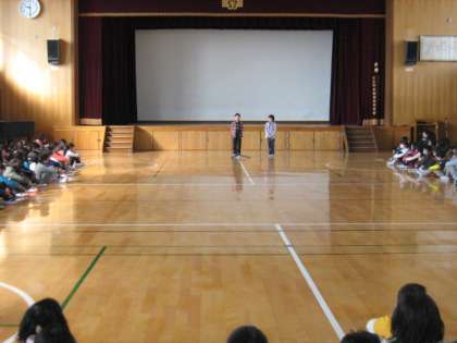 児童朝会では子ども自由画美術展や児童書き初め展の賞状の授与がありました。