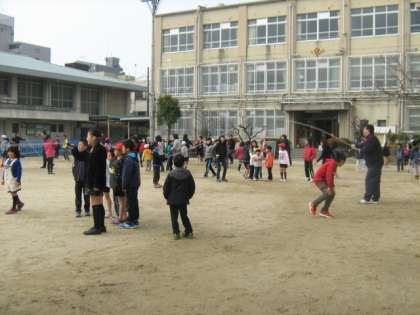 たてわりで20グループの子ども達が大縄遊びを楽しそうにしていました。