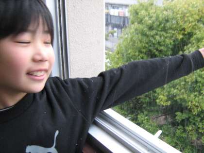 廊下の窓をあけて子どもたちが腕を出して喜んでいました。