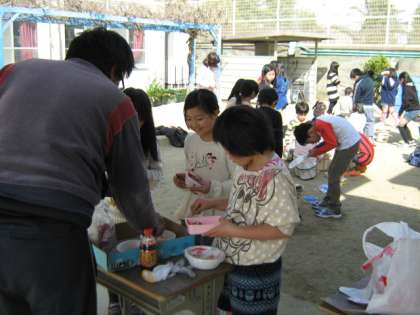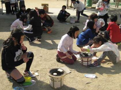 子どもたちは「なかなか火がつかなくて大変だった。」「家とちがって見ながら焼けたのできれいにやけた」