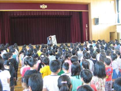 「感動とは、これいいなぁと感激すること、感謝とは、ありがとうの気持ちを表すこと、ルールとは守らないといけない決まりのこと、マナーとは他の人に対する心くばりのことです。今年度も『感動と感謝、ルールとマナー』の多い一年にしましょうね。」と校長先生のお話がありました。一年生にとっては初めての朝会でしたが、みんなきちんとお話を聞く姿勢ができていました。