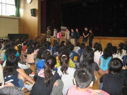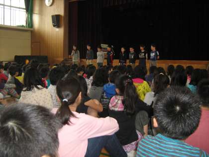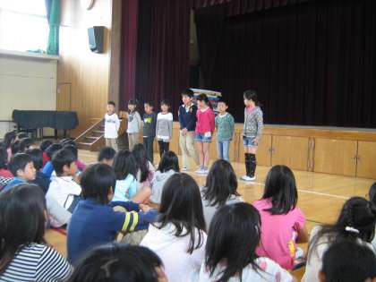 今日は全校児童の前で本部役員、各委員会の委員長、3年生以上のクラスの代表委員が挨拶をしました。