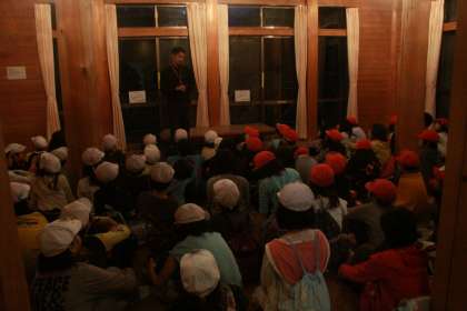 写真は野外炊事の様子と、班別会議の部屋に並べてあった上履きの様子、説明を聞いている様子です。