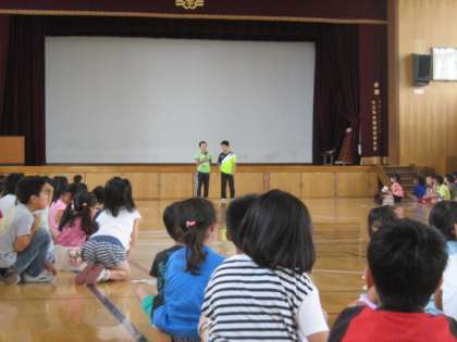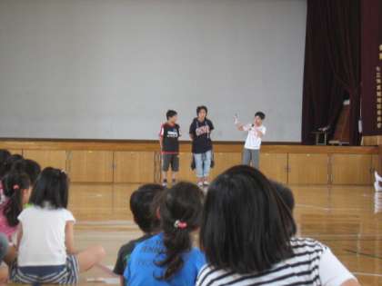 保健委員会が○×クイズで「右側をあるきましょう。」と話してくれました。