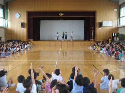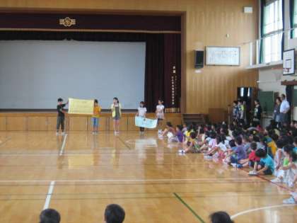 その中でも計画委員会の子どもたちが「おはよう」のあいさつの仕方、「ありがとう」のお礼の言い方、ぶつかったとき「ごめんなさい」の言い方をそれぞれ寸劇で楽しい説明をしてくれました。