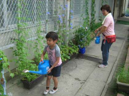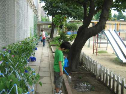 さくらの子どもたちが校庭にある朝顔に水をやっていました。
