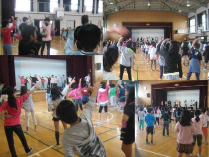昼休みには高学年が体育館に集まって運動会に向けて全校体操の練習をしました。