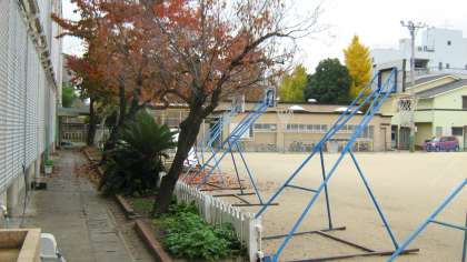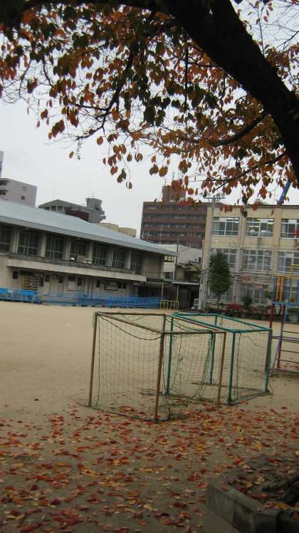 その葉が運動場に落ち赤い絨毯のようです。