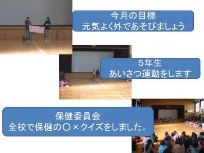 児童朝会では今月の目標、5年生のあいさつ運動、保健委員会の○×クイズがありました。