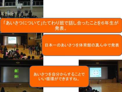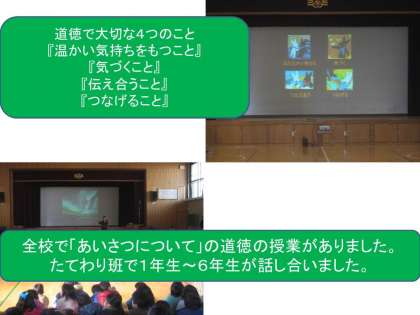 全校道徳では絵本の読み聞かせの後、あいさつについて話し合い、たてわり班で校長先生に日本一のあいさつをしました。