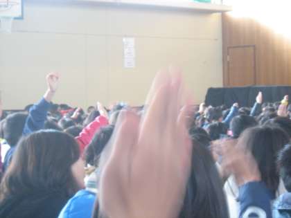 それぞれの発表ごとに全校児童から感想や質問を投げかけると大勢の子どもたちが手を挙げて「わたしも…」と感想を話します。その感想に対しても、手を挙げてその感想に意見を表示していました。『グー』は自分も同じ感想を持ち、『パー』は自分は違う感想を持ったことを表示しています。