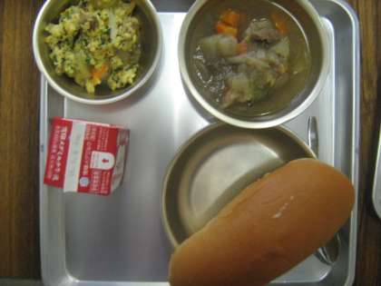 今日の給食は黒糖こっぺぱん、牛乳、変わりいりたまご、ポトフでした。