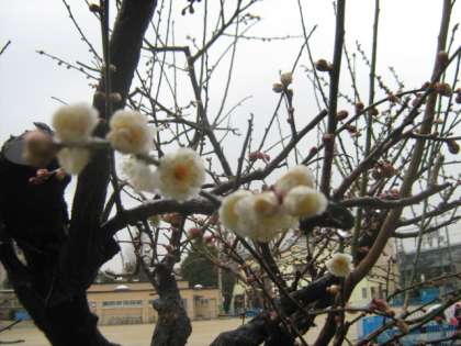 玄関の梅の花を見た子どもが「いっぱい咲いている」と話していました。