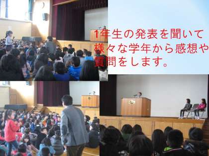 1年生の発表を聞いて、他学年が質問や感想を手を言っていました。