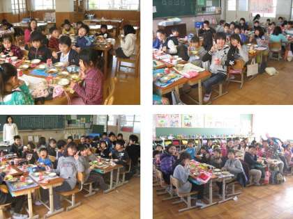 各教室に集まったみんなで給食の用意をして、元気よく「いただきます。」「ごちそうさま」をしてとても楽しそうでした。