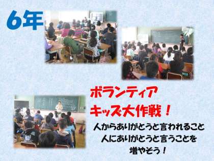今年から,ノーチャイムで過ごすときに新1年生が教室に帰る時間が分かるように,高学年が率先して1年生に声掛けをするなど,『ありがとう』が沢山ある学校にするために,『ボランティアキッズ』という取り組みも始めます。
