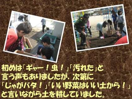 腐葉土やバーミキュライト,牛糞や鶏糞を混ぜて土作りをして,種イモを植えましたが,最初は「手が汚れた」「臭い・・・」と言っていた子ども達も,最後は「いい土を作ろう!」「いっぱい採れるといいな!」と言いながらとても意欲的に取り組んでいました。