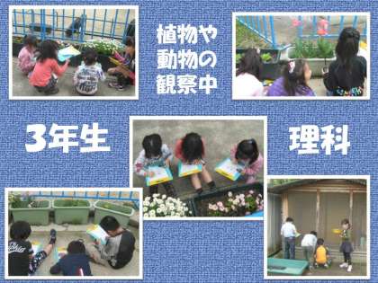 3年生は理科の学習で植物や動物の観察をしています。虫眼鏡をもって,良く見てワークシートにかいていました。