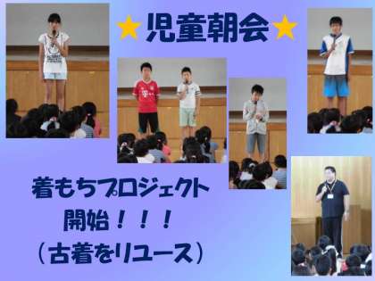 今日の児童朝会では,代表委員の子どもたちが決めた7月の目標や,体育委員会からはフリースロー大会があること,環境委員会からは着もちプロジェクトに協力してほしいことについてお話がありました。