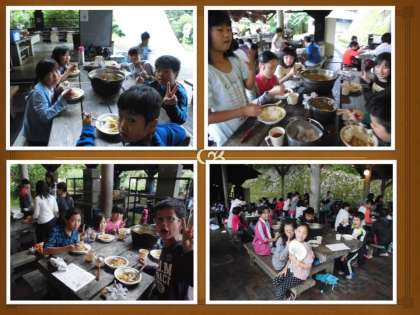 さて,野外炊事でつくったカレーを食べることに。