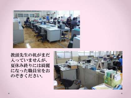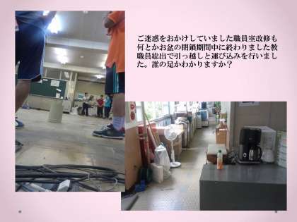 毎年いろいろな教室や玄関,体育館などを改修してきましたが今年の閉鎖日には職員室の改修を行いました。夏休み明けに,子どもたちが新装開店した職員室を見てどんな声を上げるか楽しみです。