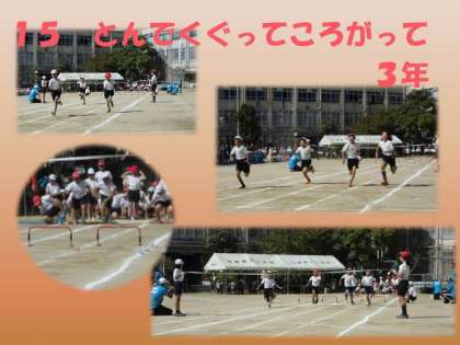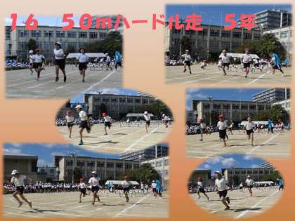 低学年はバラエティ走といって,マットで前転をしたり,ゴムをくぐったり,低いハードルを跳んだりと,学年によって色々なものを跳んだり越えたりして50mを走っています。