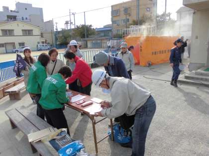 早朝よりたくさんの方々が各町内ごとに集まって小学校に避難し,下京区長様の御挨拶等を全体でお聴きした後,それぞれ3つのブースに分かれて「消火器取扱い」等の訓練を行いました。