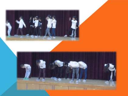 児童朝会で,ダンスクラブが全校生徒の前で踊りを披露してくれました。