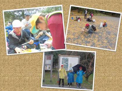 下京支部の少人数の育成学級の子ども達が集まって,まつぼっくりやどんぐり,黄色い銀杏の葉っぱを拾いました。