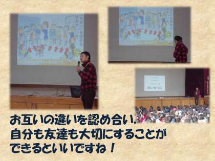 朝会では宮本先生が先生たちの得意なことや苦手なことを紹介した後,『違いを認め合う』『友達も自分も大切にする』ということについて話しました。