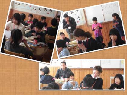 様々な学年の子どもたちと,来てくださった地域の方々とで一緒に給食を食べます。