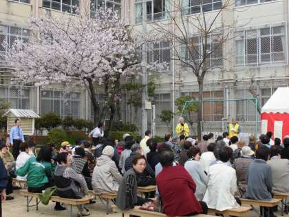 そんな中,現在校庭では社会福祉協議会主催の「お花見会」が行われています。あたたかい気候ときれいな桜に誘われるように,たくさんの方々がお越しです。
