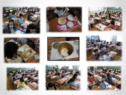 今日のおかずは「スパゲッティのミートソース煮」です。他の学年の子どもたちも大好きですが,1年生もモグモグしっかり食べています。教室に入ると,「もう全部食べた!」とたくさんの子たちがうれしそうに伝えてくれました。