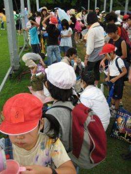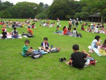 お昼ごはんは,芝生広場で班ごとにお弁当を広げました。ここまでなんとかもってくれた天気も何やらあやしい雰囲気となり,ぱらぱらと雨が降りだしました。
