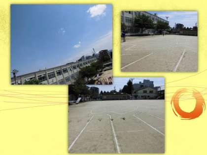 実は,昨日のうちに,運動場にラインを引くなどの準備をしていただいていましたが,昨夜の大雨でラインがほとんど消えてしまいました。雨の影響で撮影ができるかどうか心配していましたが,昨日の雨がうそのように晴れましたので,撮影を実行できることになりました。