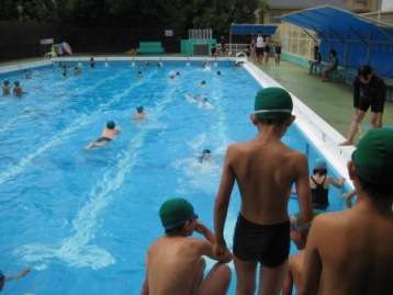 高学年の水泳学習は一日1時間です。自分の目当てをもってたっぷり泳ぐので1時間泳ぐともうへとへとになるくらいです。しばらくタオルを干したり水着を洗ったりしなければなりませんが,高学年だったら自分で洗ったり干したりするのも大切ですね。