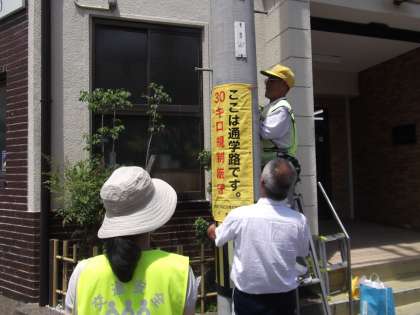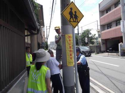 七条第三交通対策協議会の皆様により,交通量の多い花屋町通を走行する車両への啓発として,速度30km走行厳守の垂れ幕を2か所設置していただきました。西行・東行双方目に留まるようにしていただいています。