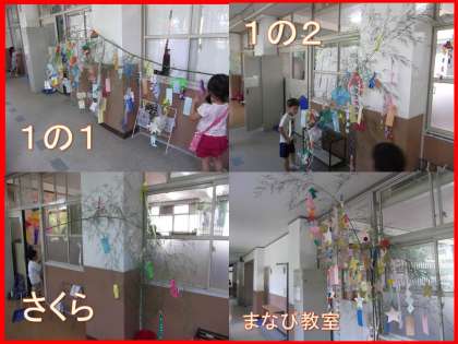 さて,さくら学級,1年生,放課後まなび教室の前に,子どもたち手作りの七夕笹飾りが登場しました。