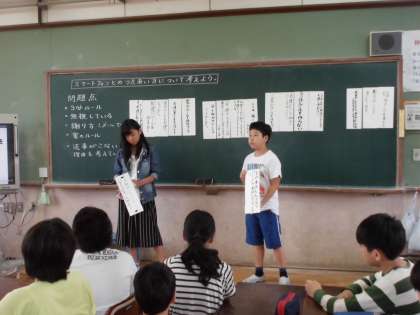 本日1・2校時,6年生にケータイ教室を行いました。講師の方も招き,6年生の2クラス,それぞれで2時間。みっちりとケータイについて学びました。