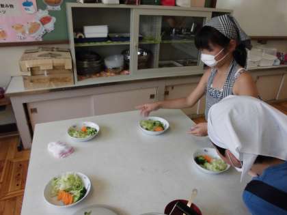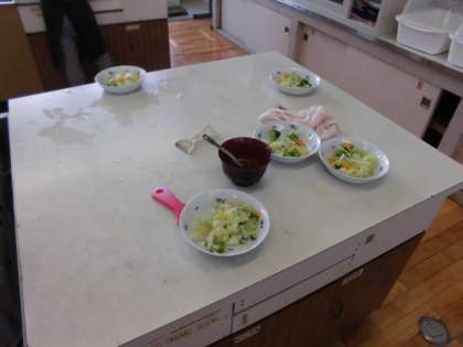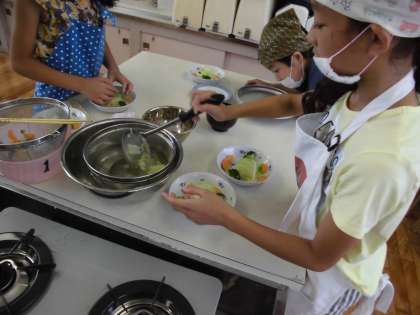 今日は5年生が家庭科の学習で「ゆで野菜のサラダ」を作りました。山の家では野外炊事を経験しているので,とてもスムーズに作れました。