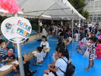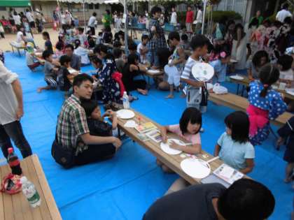 ジュースや駄菓子のお店も出て,子どもたちがどんどん集まってきています。この後の盆踊りで使ううちわやポンポン作りも進んでいます。
