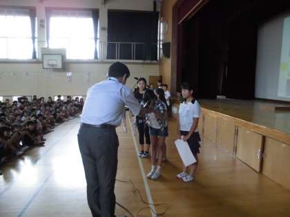 はじめに,水泳記録会や部活動の交流会で活躍した6年生の表彰を行いました。オリンピックに負けないぐらいがんばる姿がありました。