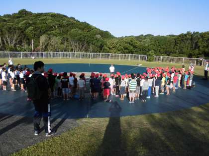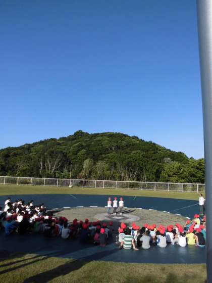 朝起きてすぐに寝具の片づけをすると,合同朝の集いです。みさきの家でともに活動する醍醐西小学校,紫竹小学校と合同で朝の集いを行いました。